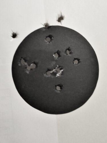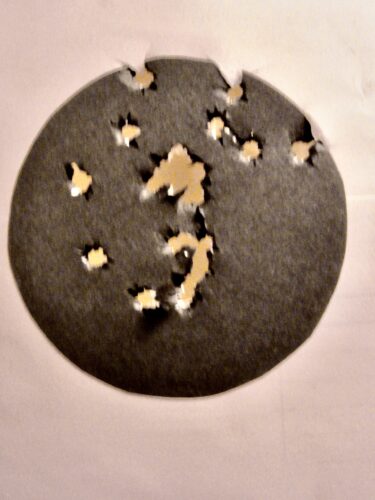 Fig. 2 – Esito di 21 tiri in appoggio con Walther PPK 7,65 alla distanza di 10 metri su disco nero con diametro di 10 cm
