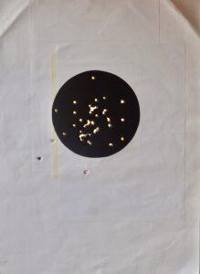 Nota 1 – Per la ricerca di un podio vi sono pistole ex ordinanza con migliori prestazioni. Per esempio, confrontando la figura 3 e la figura 10a, appare chiara la superiorità dell’ex ordinanza SIG m P/49 9mm (pistola “Neuhausen”, primo lotto consegnato a un Corpo dell’Esercito danese nell’Agosto 1949). Il risultato è stato ottenuto dallo stesso tiratore dopo cinquanta tiri lenti su bersaglio con diametro di 10 cm. In figura 10b è riportato l’esito di 40 tiri alla distanza di 25 metri su disco nero con diametro di 19 cm.