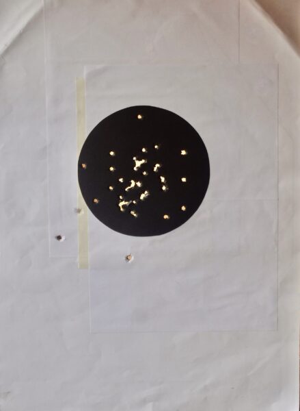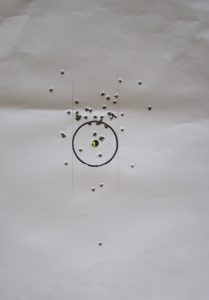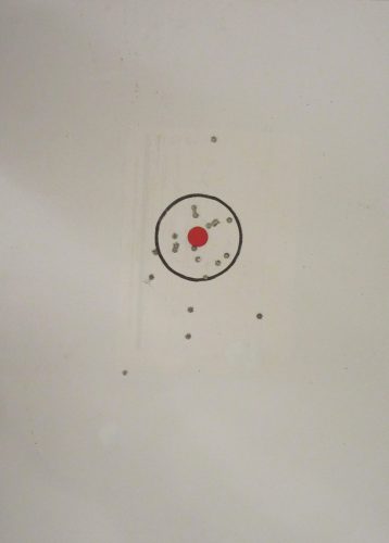 Per comprenderlo, mi sono recato presso un Centro di tiro e ho utilizzato un bersaglio a forma di cerchio con diametro di 10 cm alla distanza di 13 metri e cartucce commerciali aventi palla FMJ di 73 grani a punta ogivale. I risultati sono evidenziati in figura 8 e in figura 9.