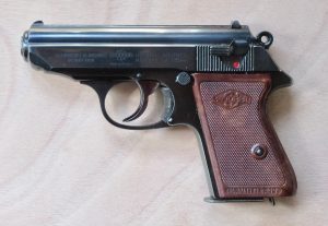 La Walther PPK 7,65 è un’arma semiautomatica storica: fu progettata nell’azienda tedesca Carl Walther GmbH Sportwaffen come evoluzione in formato compatto della Walther PP e nel 1932 l’azienda ne iniziò la produzione in Turingia a Zella-Mehlis, per metterla a disposizione di una sezione di agenti in borghese della Polizia tedesca. Per tale motivo fu denominata “PPK”: Polizei Pistol Kriminal. Nel 1952 la Walther concesse all’azienda francese Manurhin (“Manufacture de machines du Haut-Rhin” con sede a Mulhouse in Alsazia) la licenza di produrla, gravando sulla sconfitta Germania il divieto di fabbricare armi (Fig. 1). Dal 1957 l’azienda Carl Walther ne riprese la produzione a Ulm am Donau in Germania. Vi fu un’iniziale fase in cui la produzione dei pezzi proseguì presso la Manurhin; l’arma era successivamente assemblata, brunita e sottoposta al banco di prova in Germania. L’arma fu in dotazione a Corpi della Polizia tedesca fino agli inizi degli anni ‘70, ma ebbe anche diffusione in ambito civile, avendo acquisito notevole notorietà in primis per il favorevole rapporto tra compattezza e precisione, ma probabilmente anche grazie al personaggio di James Bond, che l’aveva in dotazione nella maggior parte dei film della serie “Agente 007”. Fu particolarmente apprezzata negli Stati Uniti, dove, per aggirare un divieto di importazione di armi supercompatte (il Gun Control Act del 1968), fu commercializzata dalla Walther la PPK/S, leggermente più alta – quanto bastava per aggirare il limite legale – essendovi combinato il fusto di una PP e la canna di una PPK. Nel 1978 iniziò la produzione della PPK/S negli Stati Uniti. L’arma era disponibile nei calibri 7,65 mm e 9 mm corto e fu prodotta da Ranger Manufacturing a Gadsen (Alabama) su ordinazione di Interarms (Alexandria, Virginia), che aveva ottenuto la licenza di produzione dalla Carl Walther. Nel 1998 la licenza fu concessa alla Smith & Wesson, che produsse la PPK/S nel calibro 9 mm corto e 22 LR. Infine, dall’anno 2018, la PPK e la PPK/S sono prodotte rispettivamente nel calibro 9 mm corto e nel calibro 9 mm corto (.380 ACP) o 22 LR dalla stessa Carl Walther nel suo stabilimento statunitense a Fort Smith in Arkansas.
