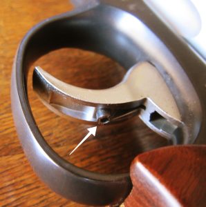Ho quindi ideato una soluzione reversibile, consistente nel fissare sul telaio posteriormente al grilletto con una fascia adesiva uno spessore in materiale solido, ma anche atraumatico per la raffinata brunitura del metallo (Fig. 1). Lo spessore è tale da arrestare l’arretramento del grilletto subito dopo lo scatto del cane.