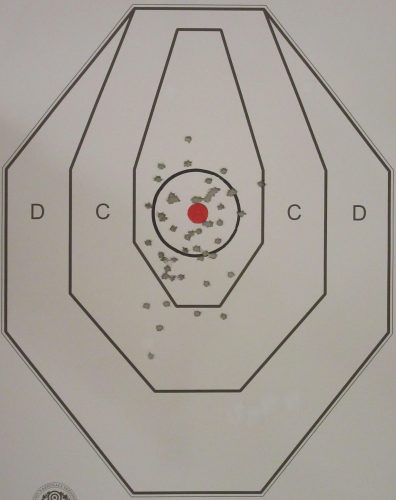 E’ evidente il miglioramento nelle due recenti prove rispetto al risultato evidenziato in figura 2, nella quale si evidenzia un esiguo 20% di tiri (10/50) all’interno del cerchio. Meno evidente è la differenza tra la prova di tiro rapido evidenziata in figura 9 e la prova di figura 3, che tuttavia è stata effettuata con tiri molto ponderati, molto lenti, con il fermo obbiettivo di non colpire il capo della sagoma. Questo approccio derivava dall’esito insoddisfacente di due precedenti prove in cui i tiri rapidi si erano risolti in una costellazione di strappi. La prova di figura 9 indica che i provvedimenti messi in atto si sono tradotti nella possibilità di ottenere una rosata decentemente concentrata con tiri rapidi anche in assenza di una consolidata esperienza da parte del tiratore con l’uso di semiautomatiche.